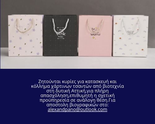 Ζητούνται κυρίες για κατασκευή και κόλλημα χάρτινων τσαντών από βιοτεχνία στη δυτική Αττική για εργασία πλήρους απασχόλησης,επιθυμητή η σχετική προϋπηρεσία σε ανάλογη θέση